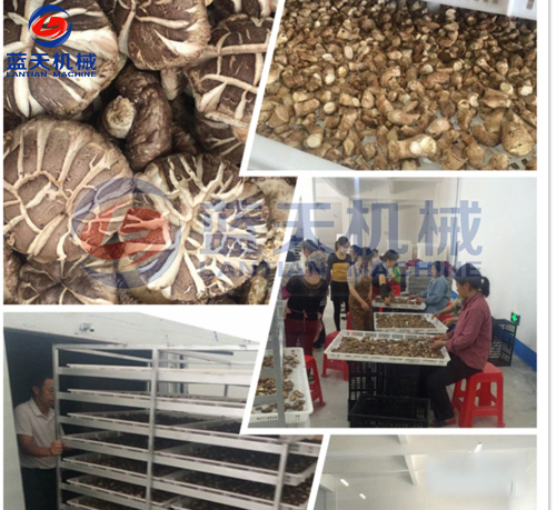 1:準備好物料:采收前一天禁止澆水,適時采收。香菇應在四五成熟時采收,一般采收均不能超過八成熟。采收的香菇分好類,先在陽光下暴曬2-3小時,以去除部分水分。裝盤時使菌蓋朝上,菌柄朝下,擺均放正,不可重疊積壓,以防傷菇而影響質量。香菇采收后6小時以內必須烘烤,如果有冷藏條件,保存時間可適當延長。